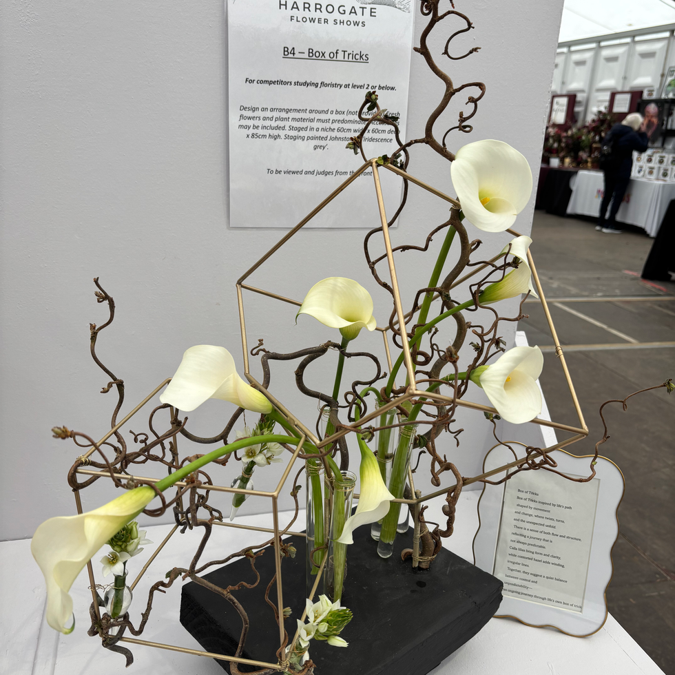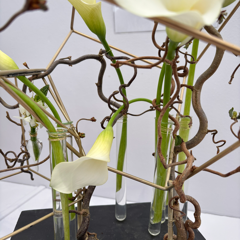A cleverly constructed design of off-white zantedeschia and contorted hazel, arranged through and around open sided cubes which give the appearance of being suspended in mid-air.