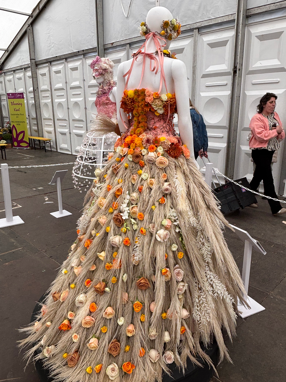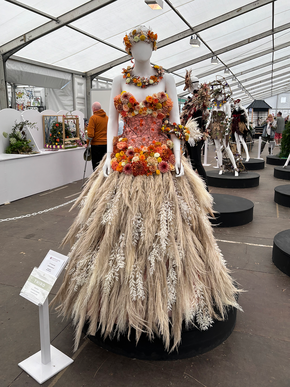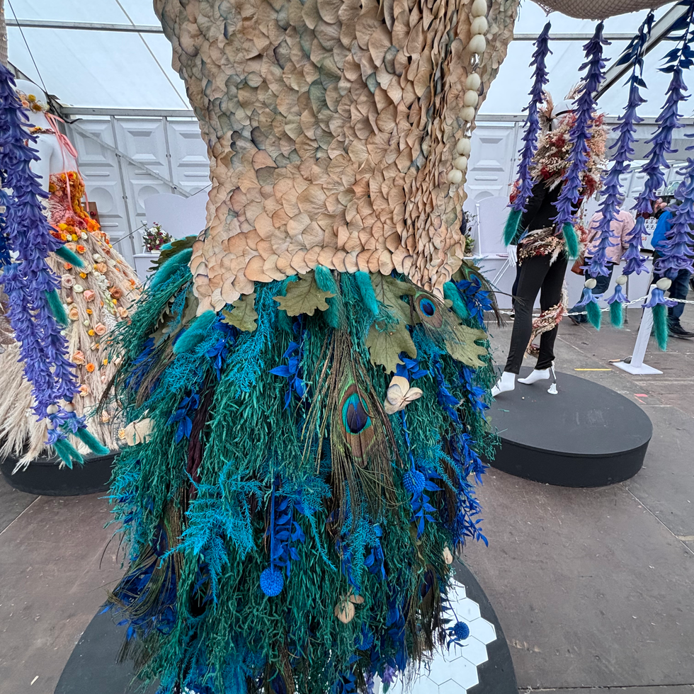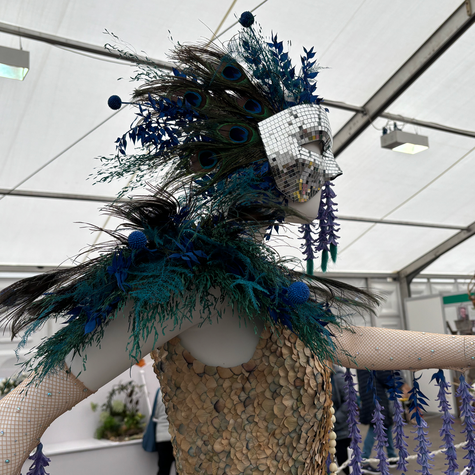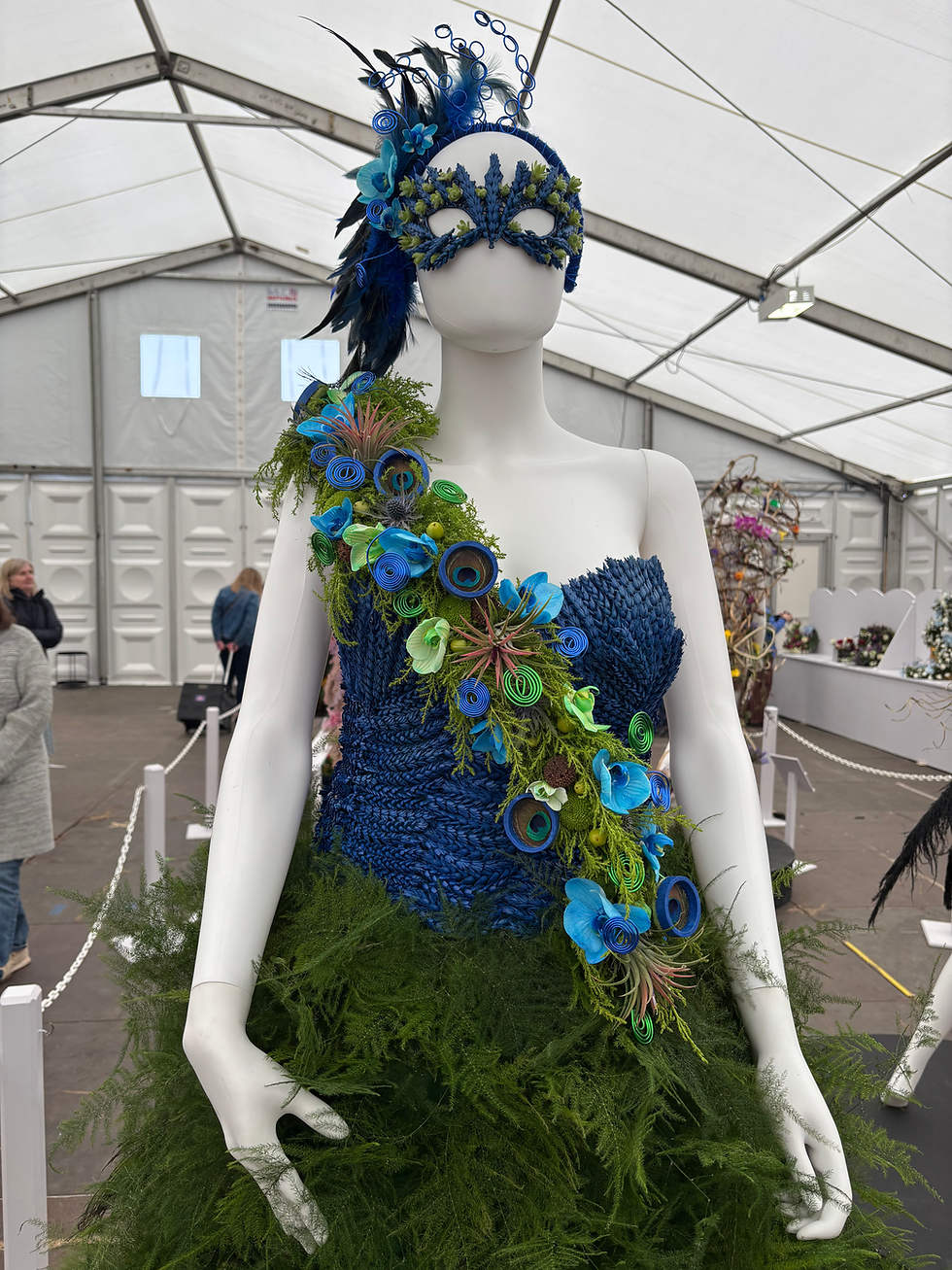 An exquisite flapper-inspired dress with a skirt of peacock feathers and dried materials below a bodice painstakingly made from preserved hydrangea petals. Pipped hyacinths, which seem to be a trend right now, and bold shoulder pads with a Phantom of the Opera style mask complete the dramatic look.