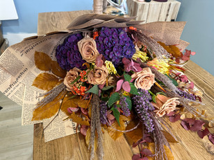 Join Karen as she unveils a stunning flat-back hand-tied bouquet, wrapped in vintage-style kraft paper that could double as a door swag. This presentation bouquet is a fantastic example of the latest autumn trends, featuring muted autumnal tones and eco-conscious materials. Featuring Roses, Hydrangeas, Dahlias, Gerbera and Kalanchoe with Mint, Eucalyptus and Golden Beech.
